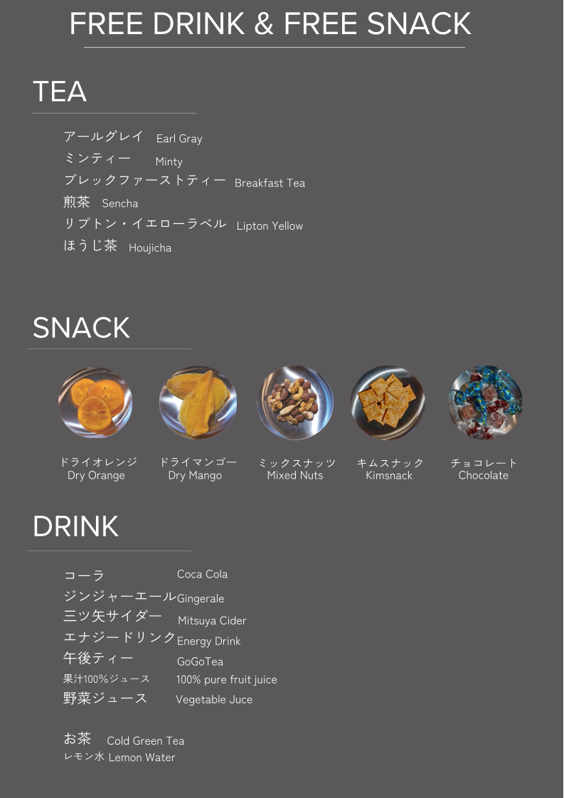 - Snacks: Four types of health-conscious snacks are available for unlimited enjoyment.
