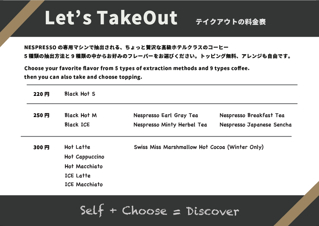 60分/600円、時間内ネスプレッソコーヒー、スナック、ティー、ココア、コーラ、各種コールドドリンク無料