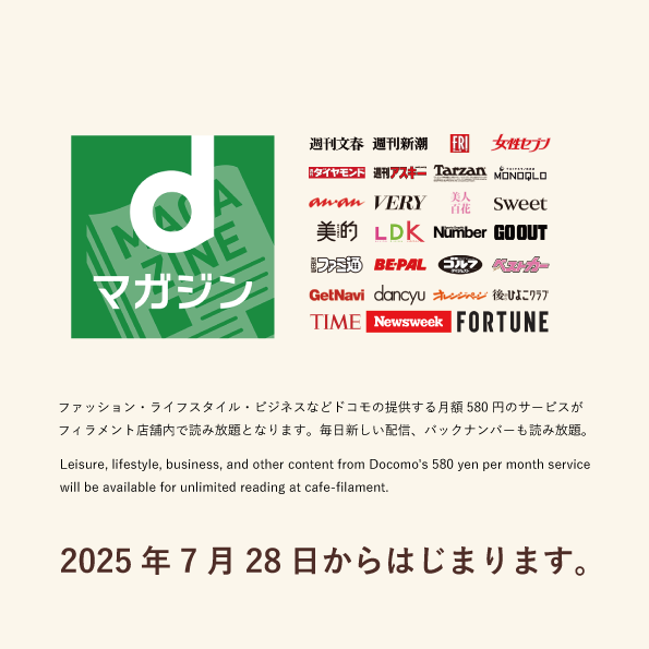 お客様のスマホ・タブレットが人気雑誌に大変身! 2,400誌、4,300冊以上(最新・人気・バックナンバー含む)の雑誌がご利用時間内読み放題です。 店内でゆったりとお楽しみください♪ (dマガジンアプリのダウンロードが必要です。)