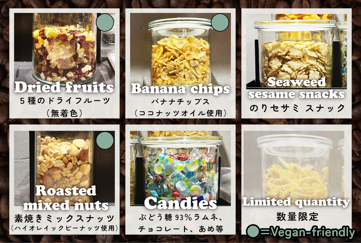 長時間作業後のエネルギーチャージにもピッタリなスナックもご用意しております。 ①アメリカ産ハイオレイックピーナッツを使用したノンフライの5種ミックスナッツ ②甘いコーヒーの後の箸休めにピッタリなスナック ③鮮やかな無着色のドライフルーツ ④ブドウ糖高配合のラムネ ⑤チョコ・キャンディー ⑥ココナッツオイルで揚げた無添加バナナチップス